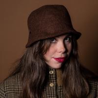 Sam is wearing a Le Panache Paris© bucket hat made in France with Go Couture_61143, Gabriel© brand fabric, 100% Trevira cs, brown houndstooth pattern on a coffee background.